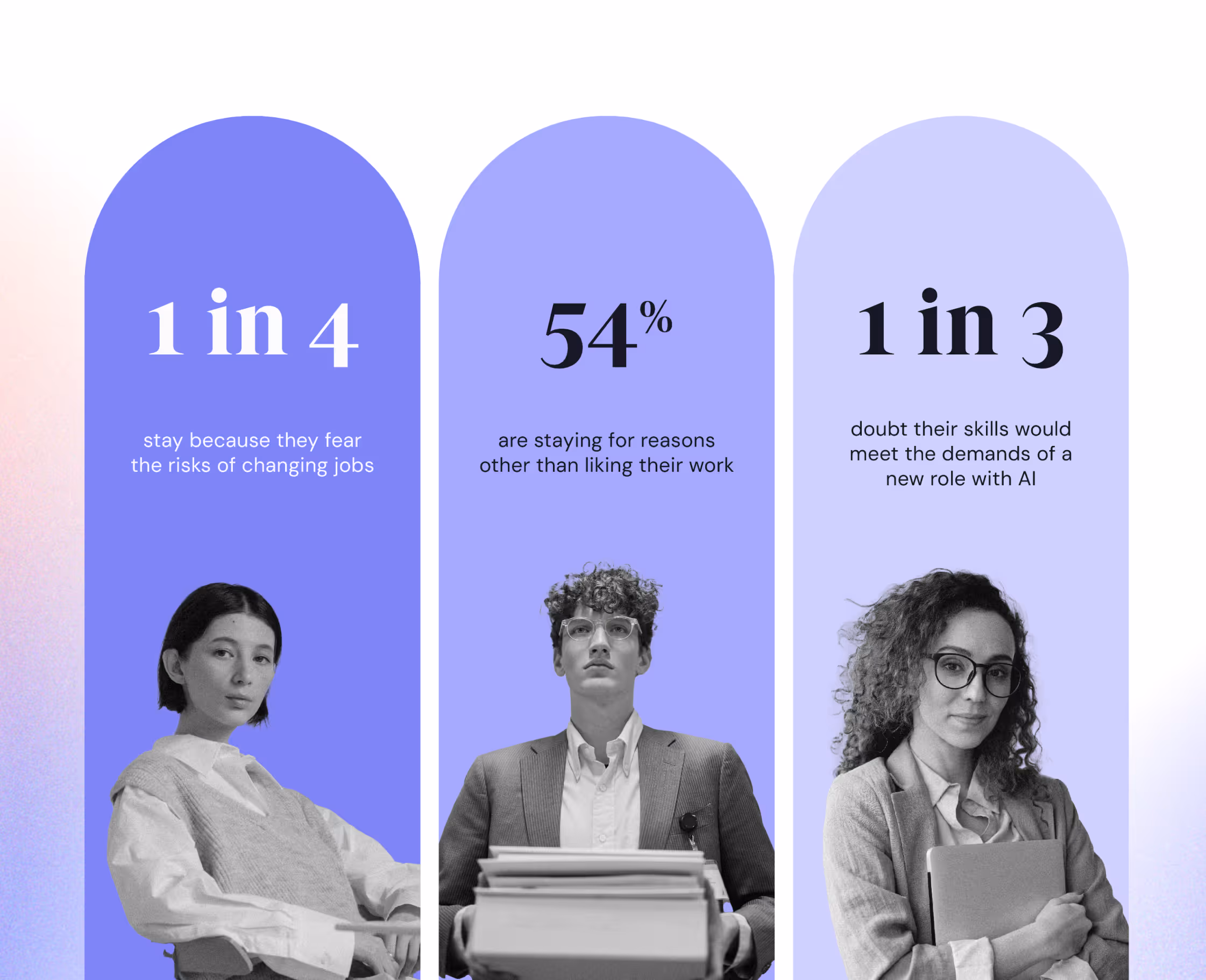 At the same time, AI is changing job requirements so quickly that 33% of employees doubt their skills would match what’s expected in a new role. Under that pressure, people are choosing safety over satisfaction.