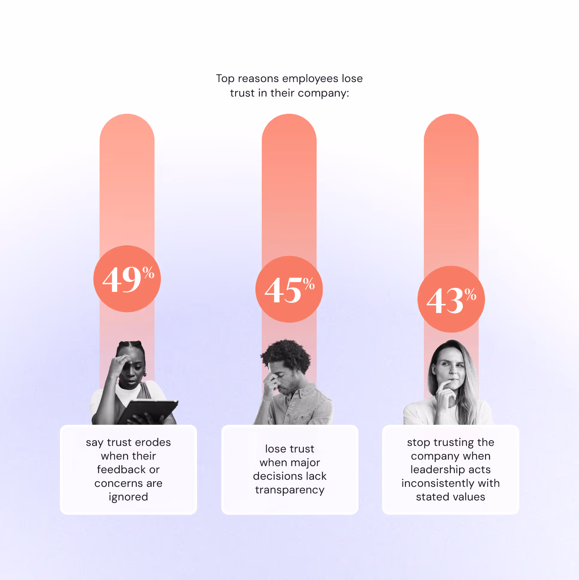 The trust gap goes beyond HR; it shapes how employees view the entire company. Trust erodes when feedback is ignored, decisions lack explanation, or stated values aren’t applied consistently.