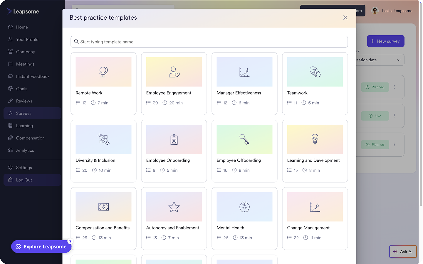 Leapsome offers customizable survey templates for manager effectiveness based on best practices, so you can quickly set up impactful leadership surveys