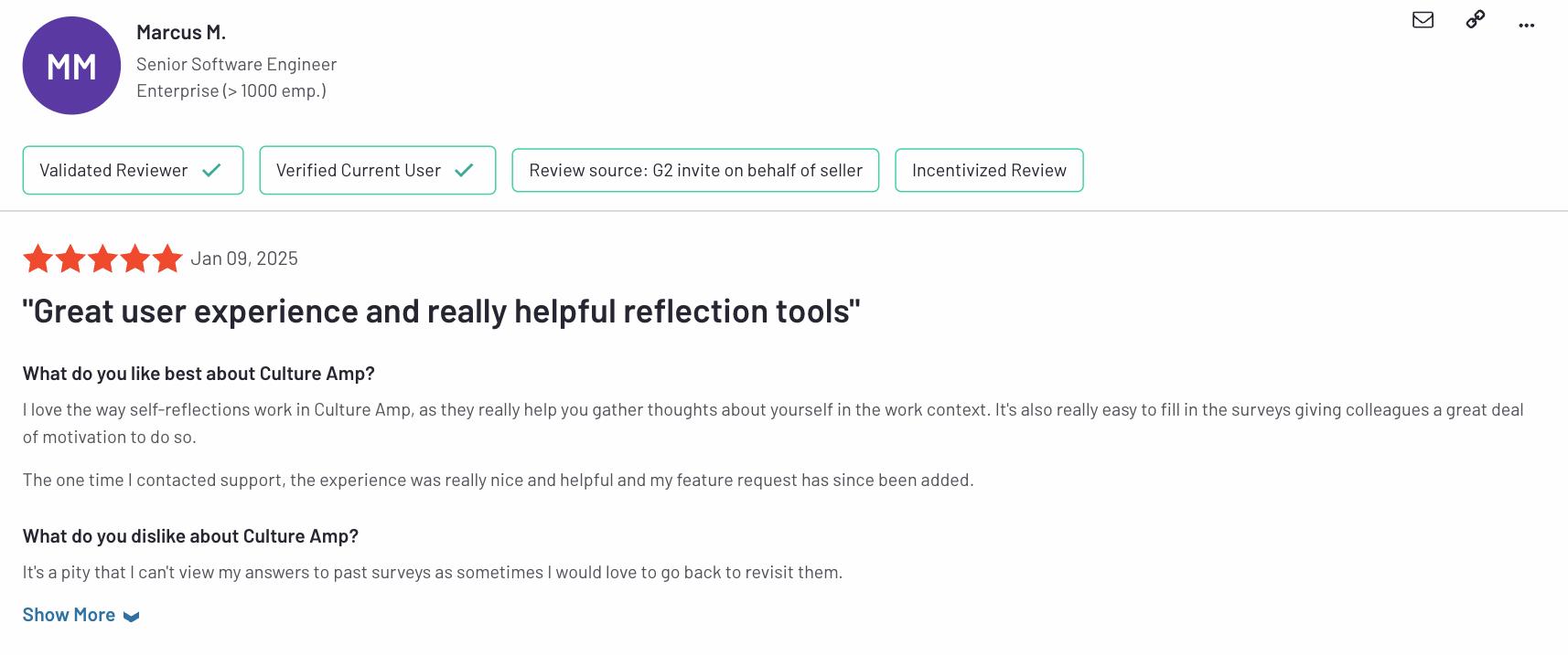 Organizations that are interested in a platform that supports 360° reviews and offers advanced People analytics. However, Culture Amp lacks additional HRIS capabilities and a built-in learning management system (LMS).