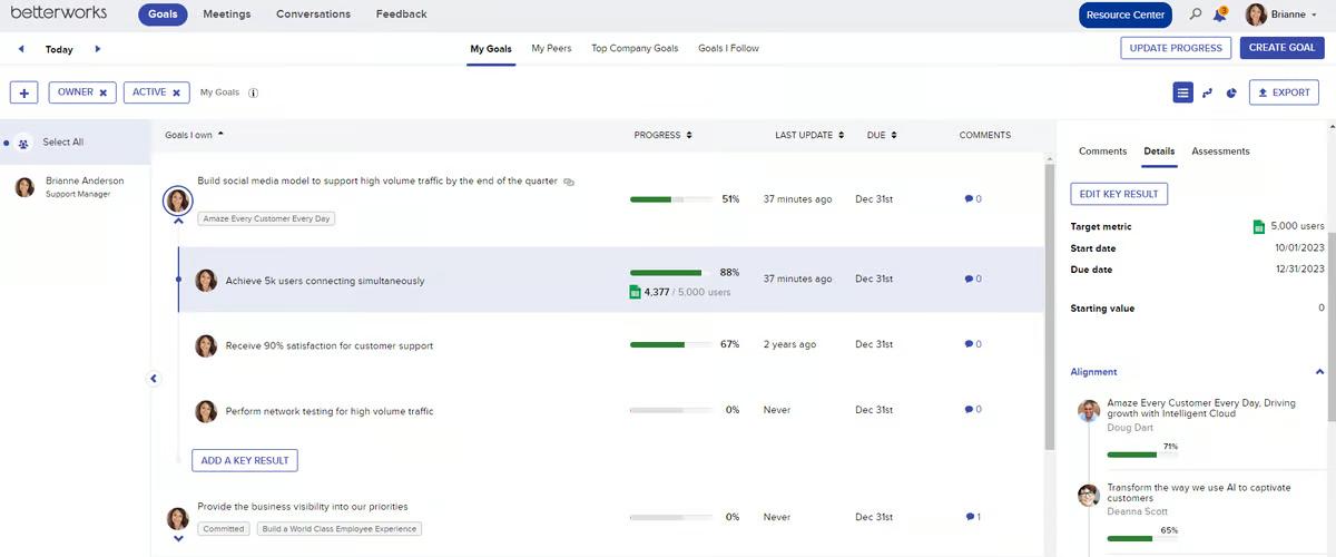 The platform’s solution for goals and OKRs offers flexible goal-setting to help users execute strategies with focus. Like Leapsome, Betterworks’ goal collaboration tools can be customized to suit different goal-setting methodologies.